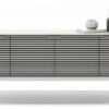 Where form and function align, this full-featured design pairs remote and audio-friendly louvered doors with an elegant console style base.