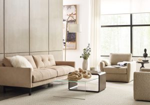 Carmet features a sleek, modernist track arm that tapers in from the top of the sofa to the bottom, for an elegant look that cannot be ignored. Its low-profile beauty is further accentuated by its plush, sloping waterfall detail that can be seen on the interior of its arm.