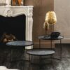 The solid appearance of white marble and smoked oak contrasts vividly with the thin black metal base, creating a cocktail table that breathes sophistication and elegance.