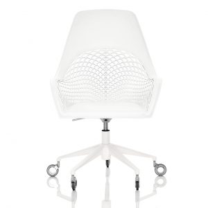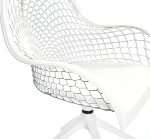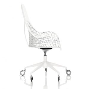 Guapa's white leather seat and lacquered wheeled base plays off its mesmerizing laser cut design and high-backed seat to create a swivel chair that looks good in any office while still providing exceptional comfort.