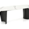 The Omnia table contains an ingenious mechanism able to expand the top surface. Pull the frame towards you so that the two legs with hidden castors slide on one side allowing the leaf to be pulled out. With a simple rotation the leaf fitted on metal tracks comes out of its housing and lines up with the top. The perimeter legs have a slanting cut in the inside part, a distinctive detail in the aesthetics.