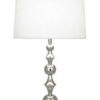 This table lamp features a slim, rectangle column with leather panels which sits on a sleek slab-like chrome base.
