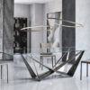 The central leg comprises two inclined elements which, with the table top, form the letters T and L. The table top and base ensemble is distinguished by clean-cut shapes and extra thickness, creating a strong visual impact.